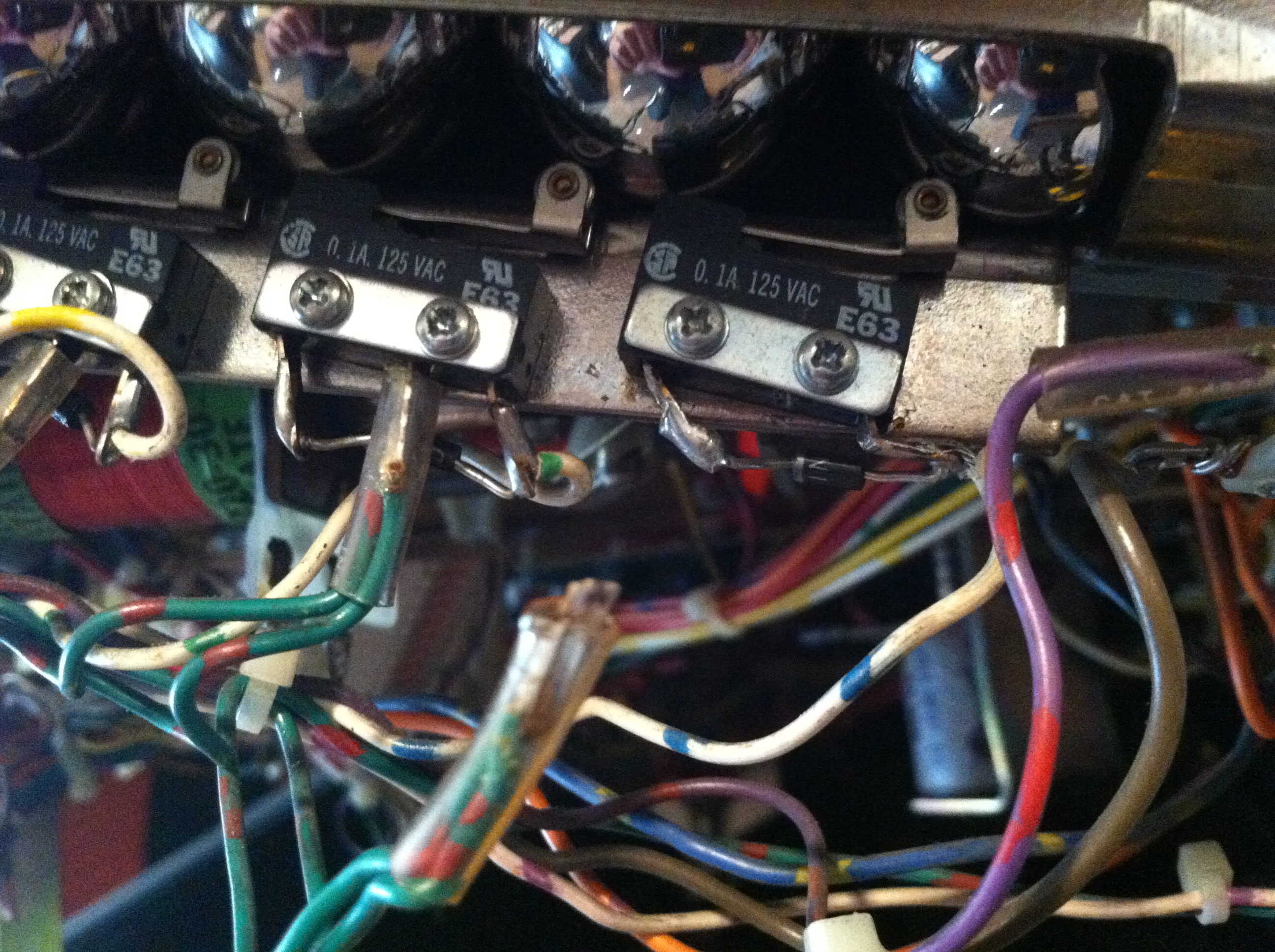 Sure enough, when I lifted the playfield, I noticed the furthermost trough switch had an problem. At first, it looked as if the double-wired positive green-red line had simply come desoldered from the middle lug; however, upon further inspection, the entire middle lug had come off!