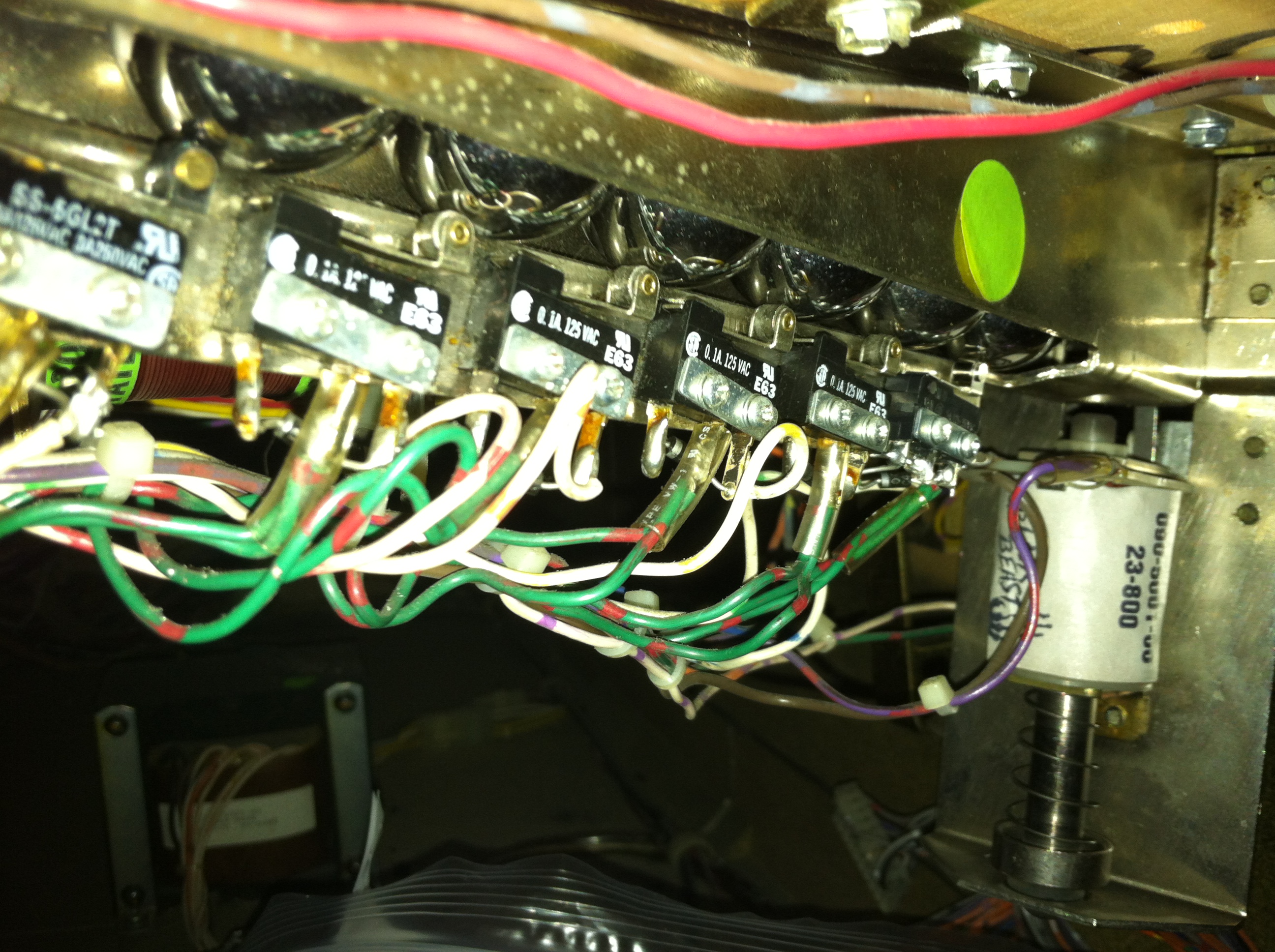 For this fix, however, I will just snap a few pictures and try to walk you guys through the problem and the solution. The other day, I was playing Tommy and some odd things started happening: Jackpots continued in multiball mode even once I was down to one ball, and then when it drained, it didn’t go into the end of ball bonus phase. With a little nudge, the sixth ball was recognized finally, but once the bonus was calculated the next ball shot out two balls rather than one. I knew immediately that I had a trough issue on my hands as all of these signs are classic examples of ball trough issues.