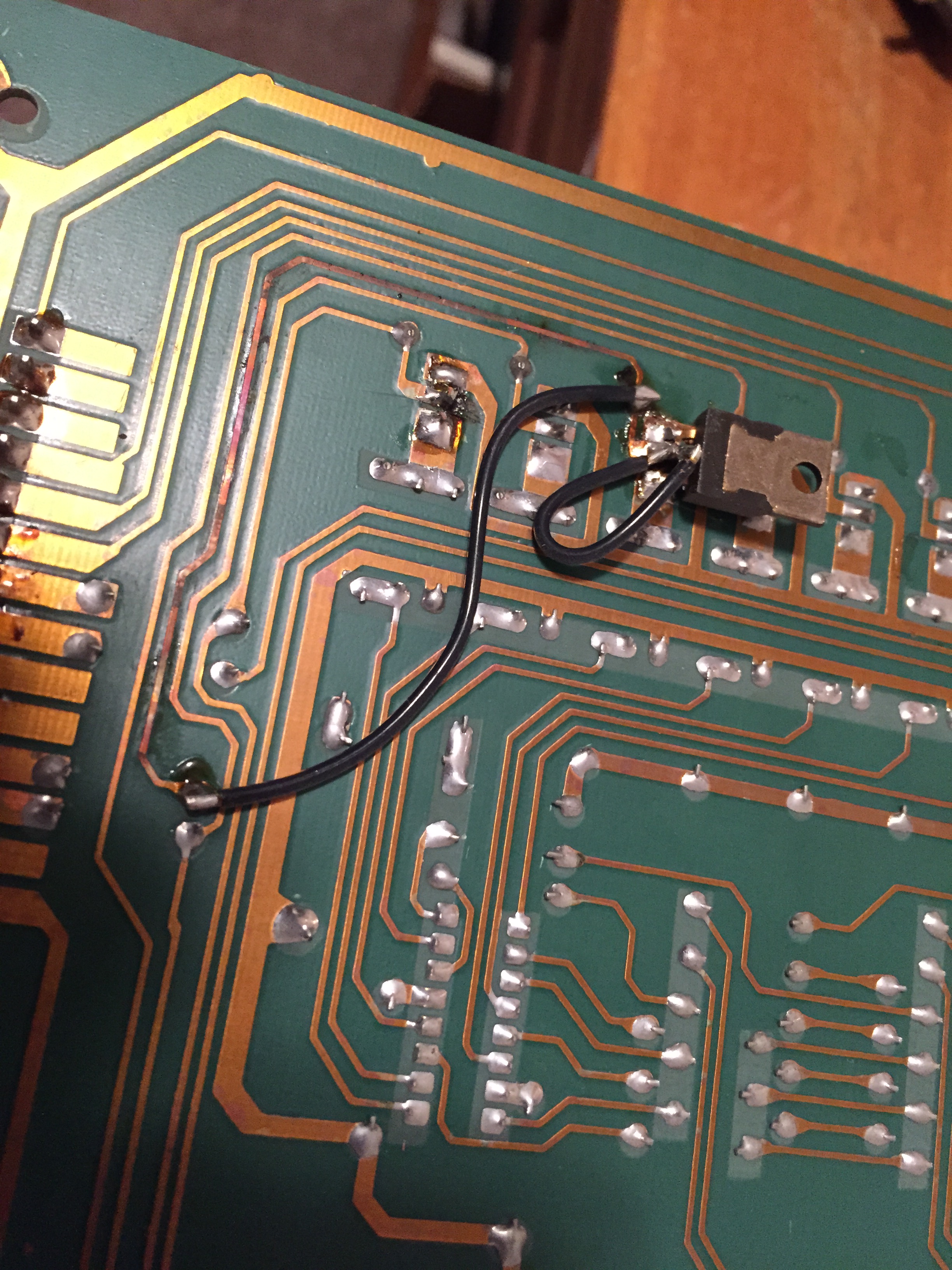 One of the transistors had been replaced on the solder side of the board and the previous tech had damaged the through holes and run some jumpers. One of which wasn’t too bad, the other which was pretty shoddy. Having this transistor on the solder side of the board was a terrible idea because it could easily ground out against the ground plane behind the board and short out all over again. I replaced this transistor with a TIP102 on the proper side of the board. I ended up having to keep one of the jumpers on the solder side, but was able to bypass the other.
